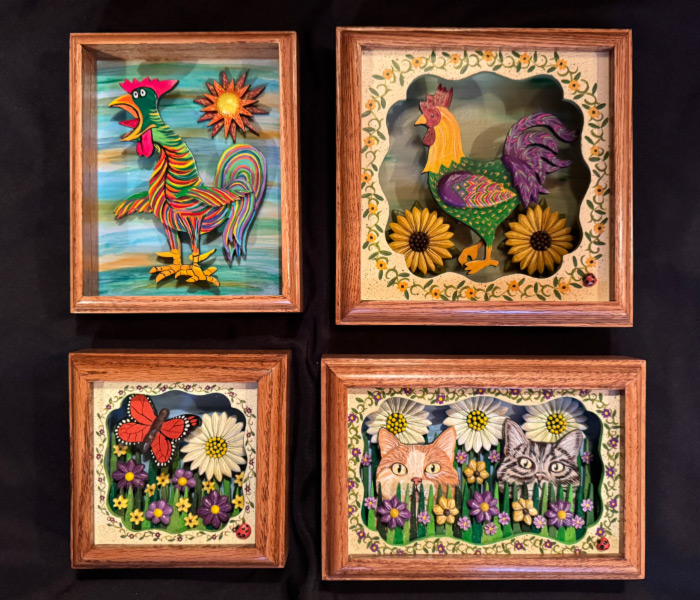 My work starts with pencil and paper designs with subject matter ranging from country memories and seasonal themes to Dios de Los Muertos and modern art, with a bit of humor thrown in. Then, starting with raw wood, I hand craft each piece, including the frames, from beginning to end. Once all the bits are final shaped and sanded, I paint each with acrylic paint, assemble the work and seal it with Water-Based Polyurethane (suitable for interior use only). The frames are finished with an oil-based stain and then sealed with several coats of hand-rubbed tung oil. Lastly, I sign and number each completed work in preparation for sending it out into the world. I hope that each one will find a good home where someone will enjoy it for a long time to come.